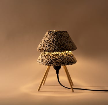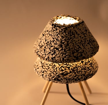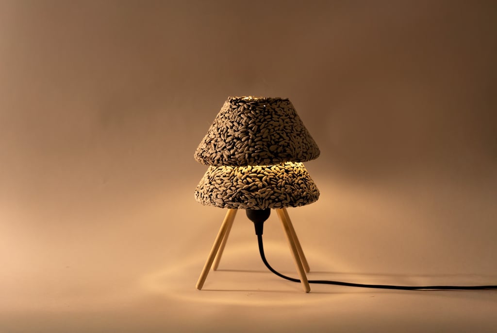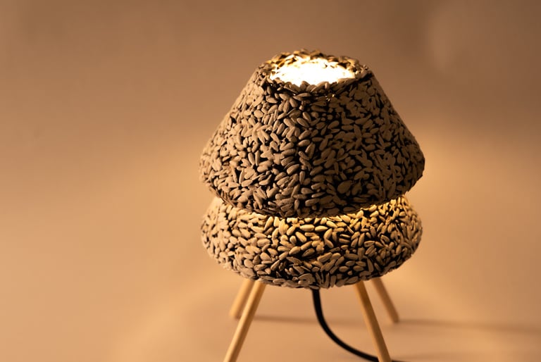 The sunflower seeds are bound together using a glelatin based bioplastic. By not altering the seeds, they still fully function as bird seed or plantable seeds. In this way, the material is simply being "borrowed" rather than consumed—temporarily shaping it into a lamp shade instead of forever changing it.
