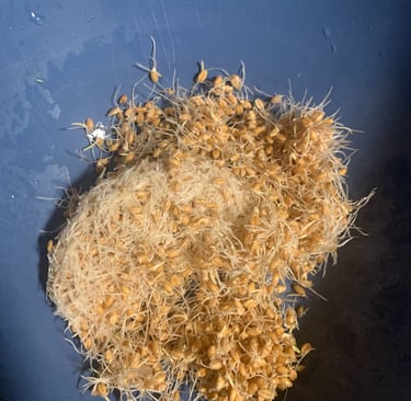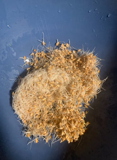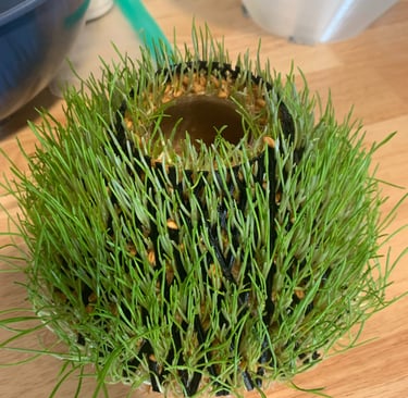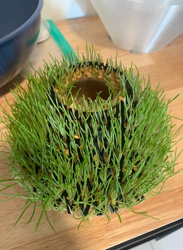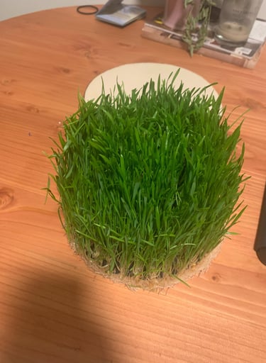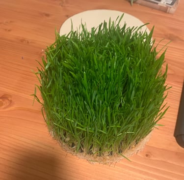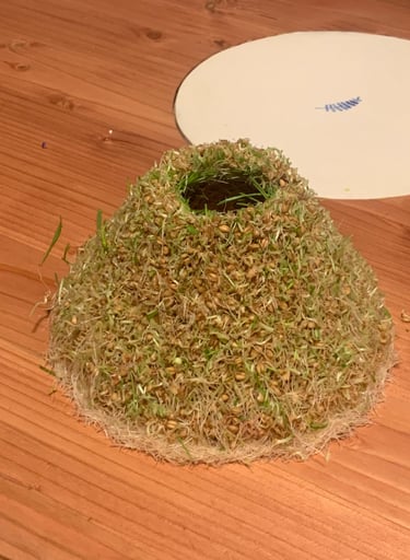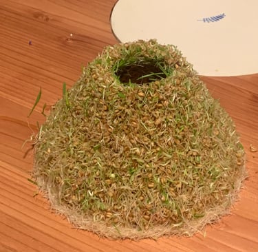 The wheatgrass seeds are sprouted in a bowl of water and then placed in a mold and watered twice a day